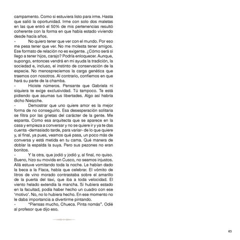 campamento. Como si estuviera listo para irme. Hasta que salió la oportunidad. Irme con solo dos maletas en las que entró el 50% de mis pertenencias resultó coherente con la forma en que había estado viviendo desde hacía años. - No quiero tener que ver con el mundo. Por eso me pesa tener que ver. No me molesta tener amigos. Ese formato de relación no es exigente. ¿Cómo será si llego a tener hijos, carajo? Podría enloquecer. Aunque, supongo, entonces vendrá en mi ayuda la tradición, la sociedad e, incluso, el instinto de conservación de la especie. No menospreciemos la carga genética que traemos con nosotros. Al contrario, confiemos en que hará su parte de la chamba. - Hiciste números. Pensante que Gabriela ni siquiera te exige exclusividad. Tú tampoco. Te está pidiendo que asumas tus libertades. Algo así habría dicho Nietzche. - Demostrar que uno quiere amor es la mejor forma de no conseguirlo. Esa desesperación solitaria se filtra por las grietas del carácter de la gente. Me espanta. Como esa arquitecta que se aparece en la casa y empieza a conversar y no se quiere ir y ya te das cuenta -demasiado tarde, para variar- de lo que quiere y, al final, ya pues, veamos qué pasa, un poco más de conversa y está metida en tu cama. Qué manera de doblar la espalda la suya. Pero sus pezones no eran bonitos. - Y la otra, que jodió y jodió y, al final, no quiso. Bueno, hizo su movida en Cusco, no seamos injustos. Allá estuve vomitando toda la noche. Le habían dado la beca a la Flaca, había que celebrar. El vómito de litros de vino morado contrastaba sobre el amarillo de la puerta del taxi, que iba a toda velocidad. El viento helado extendía la mancha. Si hubiera estado en la facultad, podía haber hecho un cuadro con ese ‘motivo’. No, no lo hubiera hecho. En ese momento no le daba importancia a divertirme pintando. - “Piensas mucho, Chueca. Pinta nomás”. Odié al profesor que dijo eso.