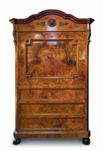 An amazing matched flame walnut ecrétaire à abattant circa 1830 in the biedermeier style. The top half opens to a desk and the bottom drawers are for storage. Can be viewed at Riverview Antiques, located at 2045 West St. Paul Ave., Milwaukee, WI. Open Tuesday through Saturday, 10 am-5 pm and Sunday 11am-4 pm. For more information call 414-278-9999, or www.RiverviewAntiqueMarket.com.