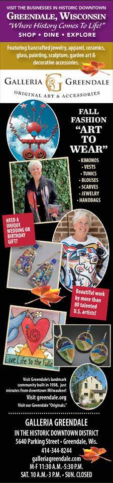 Accessorize your fall wardrobe with elegant jewelry from Galleria Greendale in the heart of historic downtown Greendale, Wis. This set of cloisonne’ enamel “landscape” earrings and necklace by Wisconsin artists Maya Madden and Wayne Farra of No Rules Jewelry is the result of inspiration taken directly from nature. More jewelry by these talented artists and others can be found in the Galleria’s cozy and charming shop, along with handsome apparel, garden art, painting, mixed media and decorative accessories. Visit the downtown businesses of historic landmark Greendale. SHOP, DINE, EXPLORE! Make a day of it in Greendale, along Parking Street and Broad Street. Galleria Greendale, 5640 Parking Street, galleriagreendale.com. 414-344-8244.