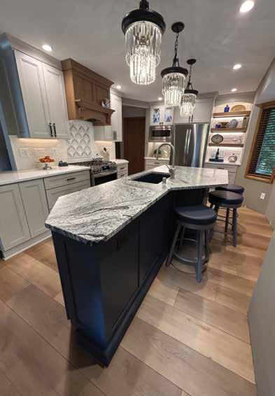 A. My designer, Gwen Adair helped to guide me with all of my selections. We made appliance selections based on our design, then we tackled the flooring selection to replace 3 different floors that covered the first floor. We had tile in the front foyer, hallways and laundry. Vinyl flooring in the kitchen, and wood floors in the great room. After deciding on the flooring that now runs throughout the 1st floor, we selected our Dura Supreme cabinets with Gwen at her showroom. We chose a painted cabinet in Putty color, and an island in Gale force Blue, we accented with Quarter sawn white oak floating shelves and a beautiful wood hood with an excellent exhaust system. These wood accents accentuate our floor and wood blinds that are on order. Now our stove actually vents to the outside, which makes our kitchen more functional as well as updating our venting needs above the new gas range. Once the cabinet selections were done, we moved to the countertops, Cabinet Hardware, plumbing sections, lighting and paint colors. Gwen truly guided us to make the choices simple and we felt confident in our choices, with so many to pick from, she guided in a manner that made our space our own and listened to what was important to us. Our living space is so unique and inviting now, and we are looking forward to the holidays in our new space. We could not be more happy with our new space, Its home again… n
