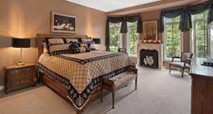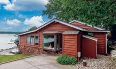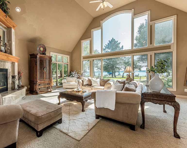 home’s façade, which is windows. The grand, two-story center entrance is flanked by a great room with cathedral ceilings to one side, and an ensuite master bedroom to the other. Lac La Belle is front and center from each room.