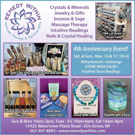 Relax & enjoy our Anniversary Event with refreshments, drawings & storewide sales! We specialize in massage therapy & spiritual gifts. You can find a great assortment of Crystals, Minerals, Jewelry, Incense & Sage, Intuitive Tarot Readings, Reiki, Home Decor and Crystal Healing information! November 16 & 17 10am-4pm 13425 Watertown Plank Road, Elm Grove, WI 262-307-8892 www.remedywithin.com