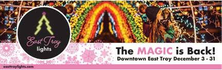 NEW YEARS EVE 8PM BALL DROP AND LAST LIGHT SHOW OF 2022 Ring in 2023 on Saturday December 31 with a big Celebration on the East Troy Village Square complete with a New Years Eve Ball Drop, coordinated Downtown events and the final East Troy Lights Presentation of the season. Celebrate the last night of the year with your entire family as you make a toast with Milk and Cookies, (of course) during East Troys kid friendly drop at 8pm. OR join the party ar midnight featuring DJ JJJ and a sparkling New Year`s Eve Light Show. Details at www.easttroy.org