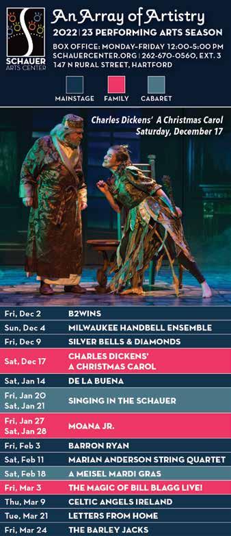 CHARLES DICKENS’ A CHRISTMAS CAROL— A NEW TWIST ON AN OLD CLASSIC A powerful story of redemption, Charles Dickens’ A Christmas Carol, has enchanted audiences the world over with its simple message of holiday joy. Come early 1:30–2:30 pm for free kids’ activities upstairs before the matinee show. Enjoy a craft project, hot chocolate, and a music activity. Saturday, December 17 3pm & 7:30pm Schauer Arts Center 147 N. Rural Street Hartford, WI Tickets: SchauerCenter.org or call 262-670-0560 ext. 3