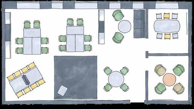 for groups of four students, while the tables and sofas at the front are for groups of eight.