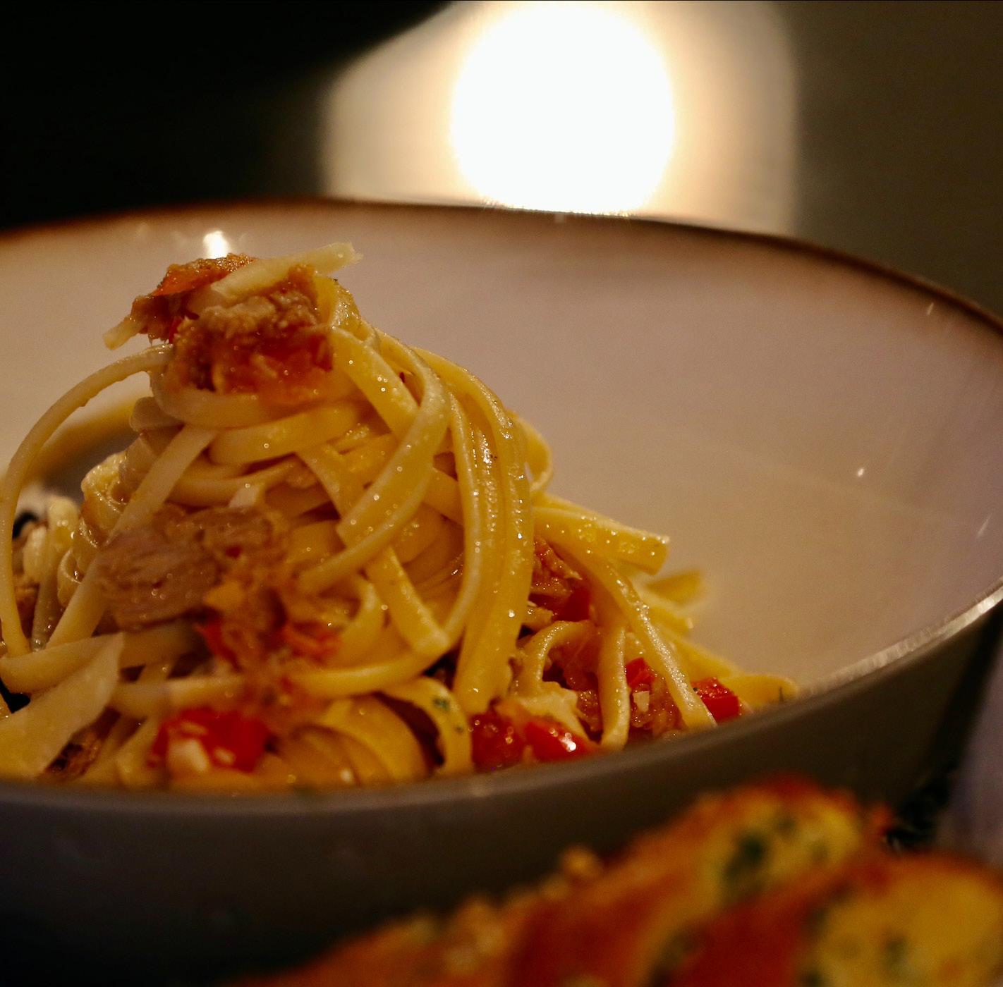 Skerið niður og kraumið papriku, chilli og hvítlauk í olíu í 2-3 mínútur. Bætið svo túnfisk út í og losið í sundur. Bætið svo smátt skornum tómötum út í ásamt salti og pipar. Sjóðið við vægan hita í 10 mínútur. Ólívur settar út á að endingu. Þessu er svo blandað saman við soðið pasta. Mér finnst svo ómissandi að hafa hvítlauksbrauð með þessu.
