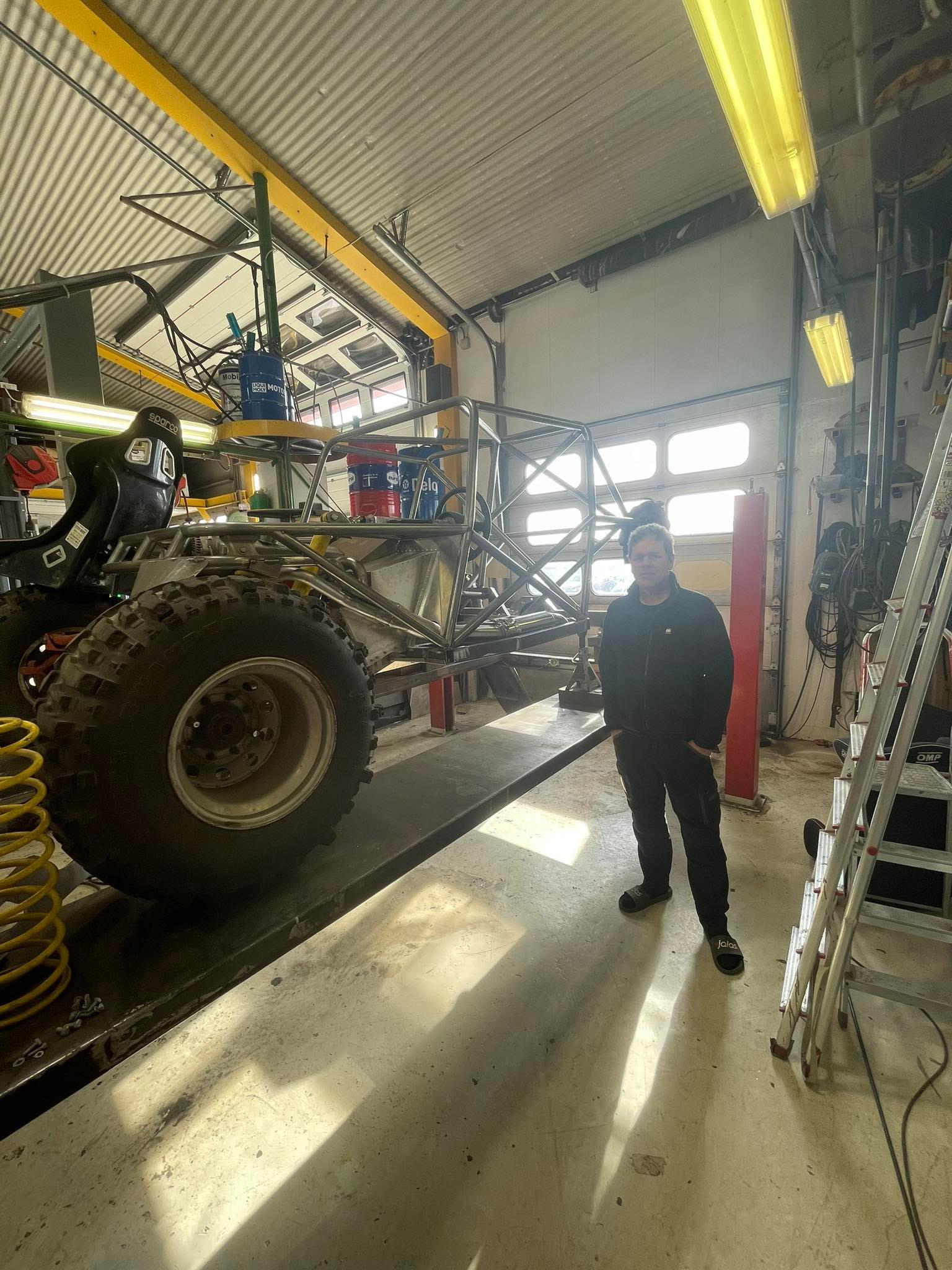 Mynd/Gunnar Pálmi Pétursson ásamt bílnum sínum sem hann er að smíða fyrir komandi keppnir.