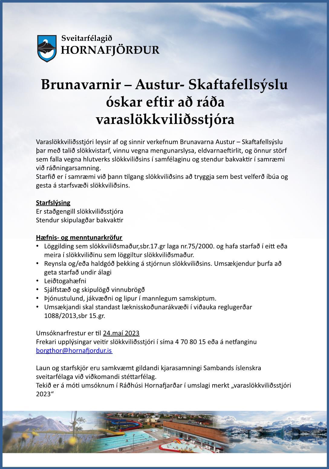 Umsóknarfrestur er til 22. maí 2023. Umsóknum ásamt ferilskrá og kynningarbréfi skal skila á netfangið afgreidsla@hornafjordur.is