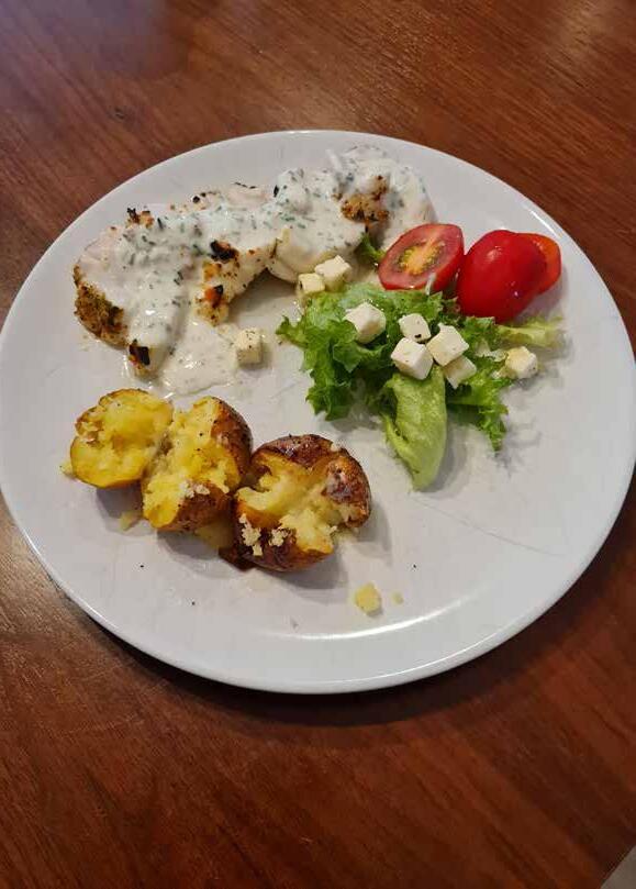 Takið eldfast mót og setjið nokkrar kartöflur í það, því næst hellið olíu í mótið þangað til að 2/5 af kartöflunni eru í olíu, smá salt yfir þær og inní ofn á 200° í 40 mín eða lengur ef þær eru stórar. Einnig er gott að hafa þetta klassíska grænfóður með.