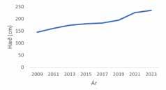 Þá höfum við líka séð að trjáplöntur þrífast misvel. Sumar vaxa jafnt og þétt og hækka smám saman eins og sést á meðfylgjandi línuriti en sú planta hefur stækkað um 90 sentimetra frá því að byrjað var fylgjast með henni. Á mynd 1 er búið að setja saman mynd af sömu birkiplöntu annars vegar frá árinu 2014 og svo frá 2023 og sést glögglega að hún hefur hækkað töluvert. Stundum hafa hlutar af merktum plöntum
