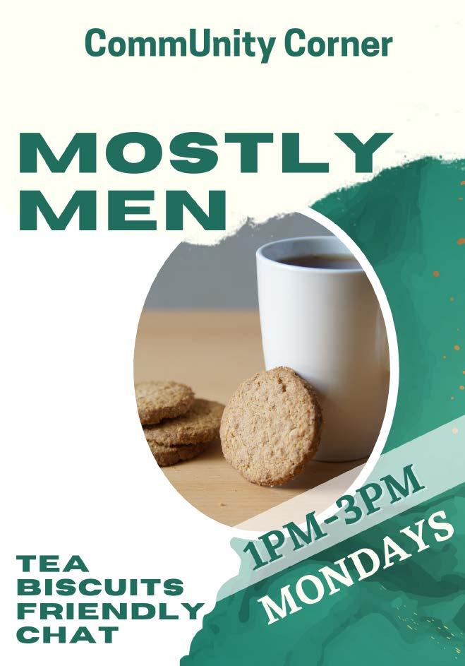 MONDAY we call Mainly Men. Between 11am-3pm, there's a space in CommUnity Corner where men can be together, have a chat, eat biscuits and chew the fat. "It gets us out of the house", says one man. "We can have interesting conversations with other men," "It's nice to chat with other men. The conversation is very different to that with women."