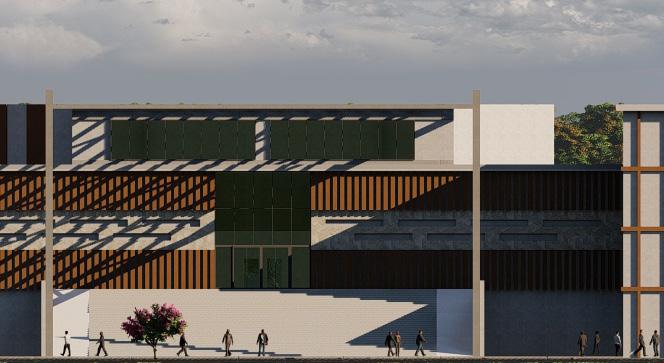 The Design takes cues from traditional japanese architecture such as projected roofs, well defined entry spaces and effective cross ventilation and uses modern materials like concrete and metal framing and neutral colors. The site is greeted with auditorium which follows angular concept which leads to the architecture and design block. These blocks follows brutalist construction with concrete material. To the front of the Institution is the administration block which follows the angular concept seperated by the entrance lobby. To the southern side of the site lays the staff quarters which accomodates 1 BHK apartments. On the rear side of the site has the mess, which caters to both hostellites and day scholars. The mess is also designed with angular planning so that it faces both the institution as wells as the hostel blocks. The hostel is designed with progressive projections on the floor to allow effective cross ventillation on all rooms and to give visual movement to the viewer. The front of the site also houses the green plaza which features thoughtfully designed communal spaces throughout the premises. These include landscaped gardens, walking paths, and seating areas strategically placed to encourage spontaneous interactions and neighborly connections.