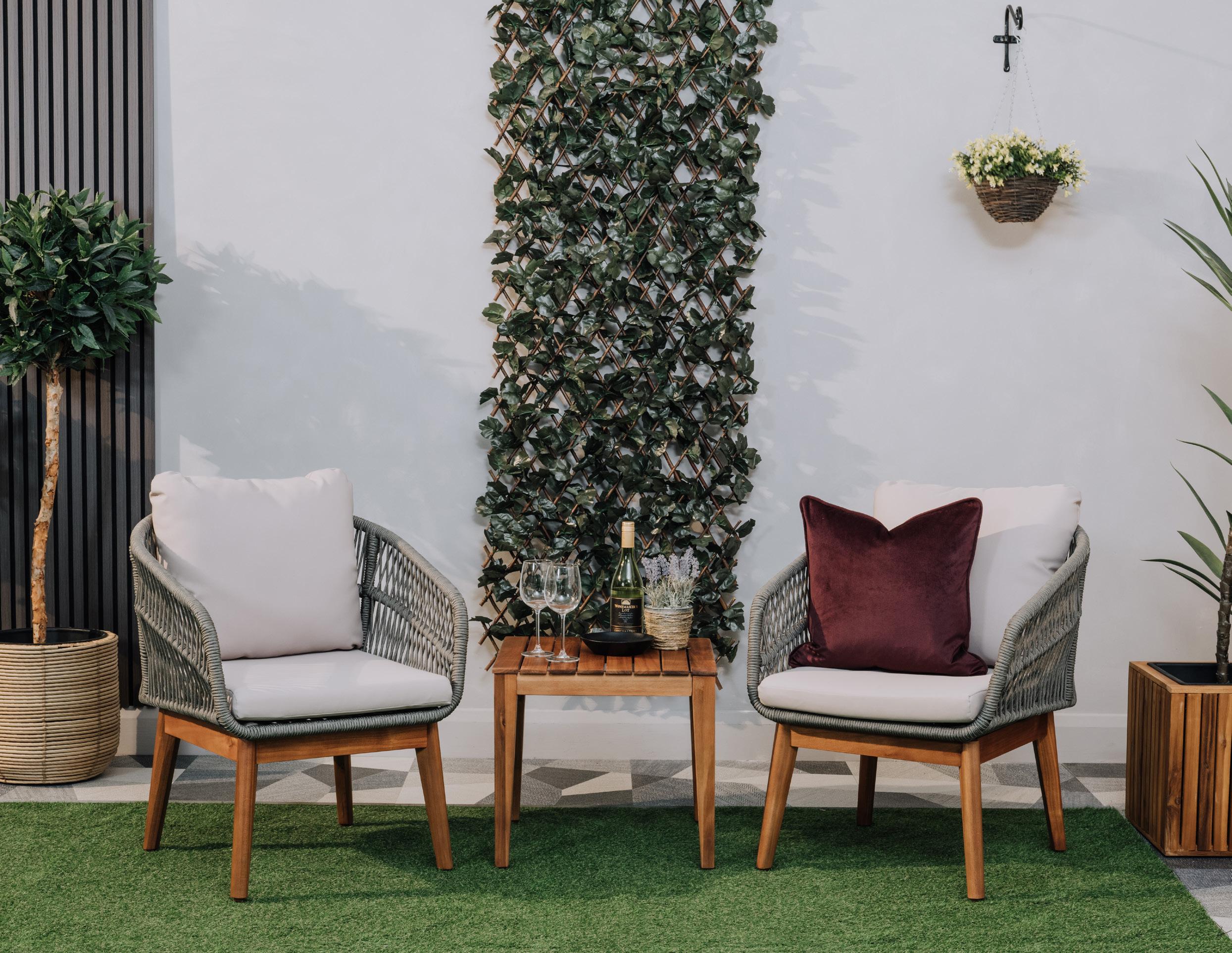 The combination of beige resin wicker and grey cushions would complement most outside spaces, ensuring that the Lupin tea-for-2 set will feel right at home.