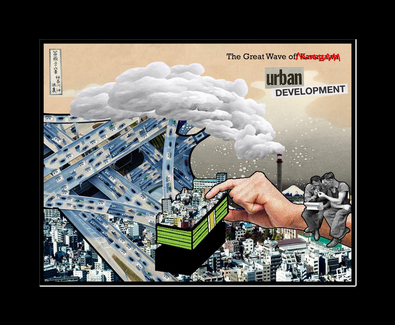 This is a digital collage made in Illustrator that highlights the negative effects of urban sprawl. The composition is directly inspired by Hokusai’s famous woodblock print The Great Wave off Kanagawa. This piece was selected for the 2024 Student Arts Program and is displayed on the fourth floor of the University Memorial Center at CU Boulder.