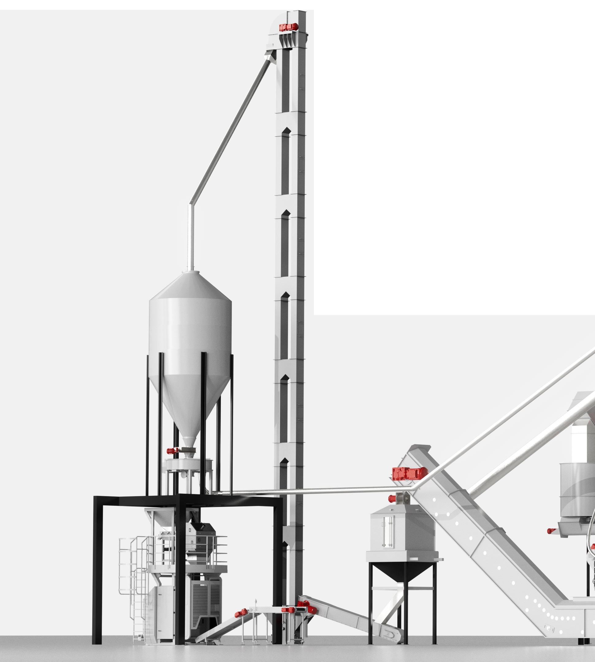 Reliable and enclosed design of all sections, preventing product spillage and dusting in the working area of the production facility.