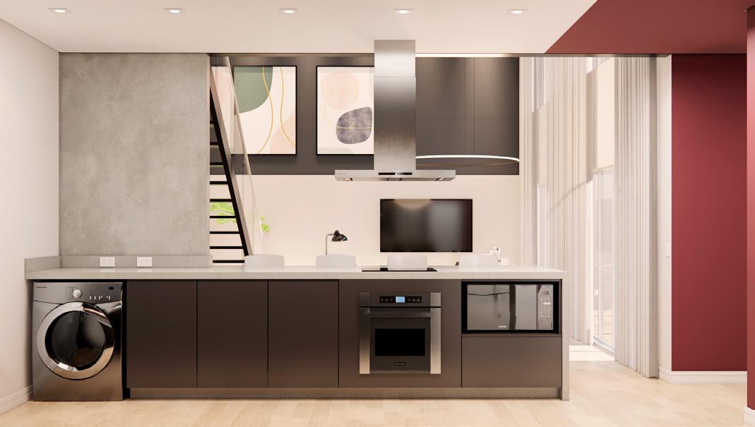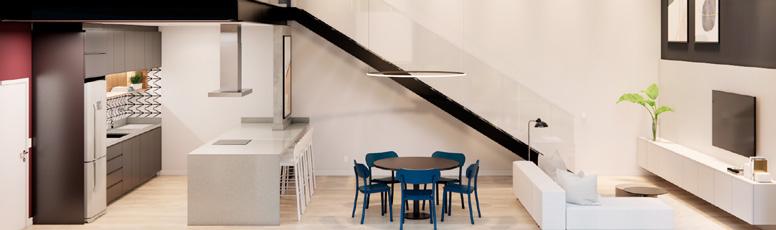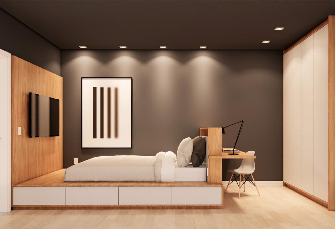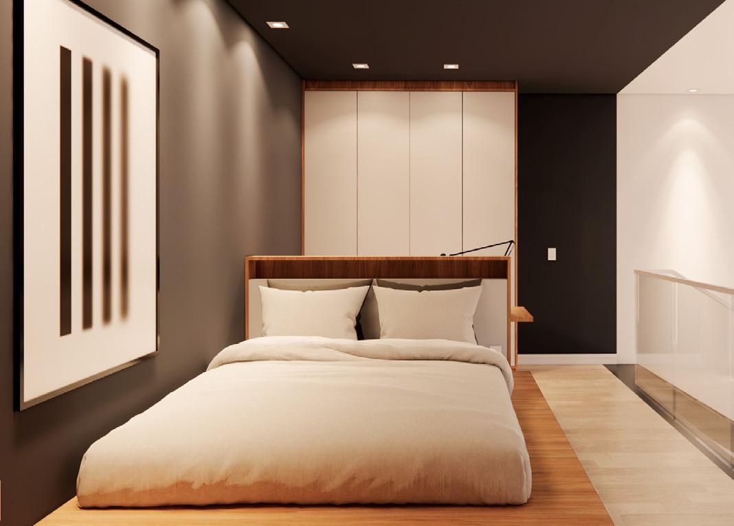 “O estúdio duplex surge a partir da imaginação de um am biente totalmente integrado e com forte personalidade. Os contrastes do claro e escuro foram os conceitos usados para este projeto, causando diversos efeitos de impacto.”