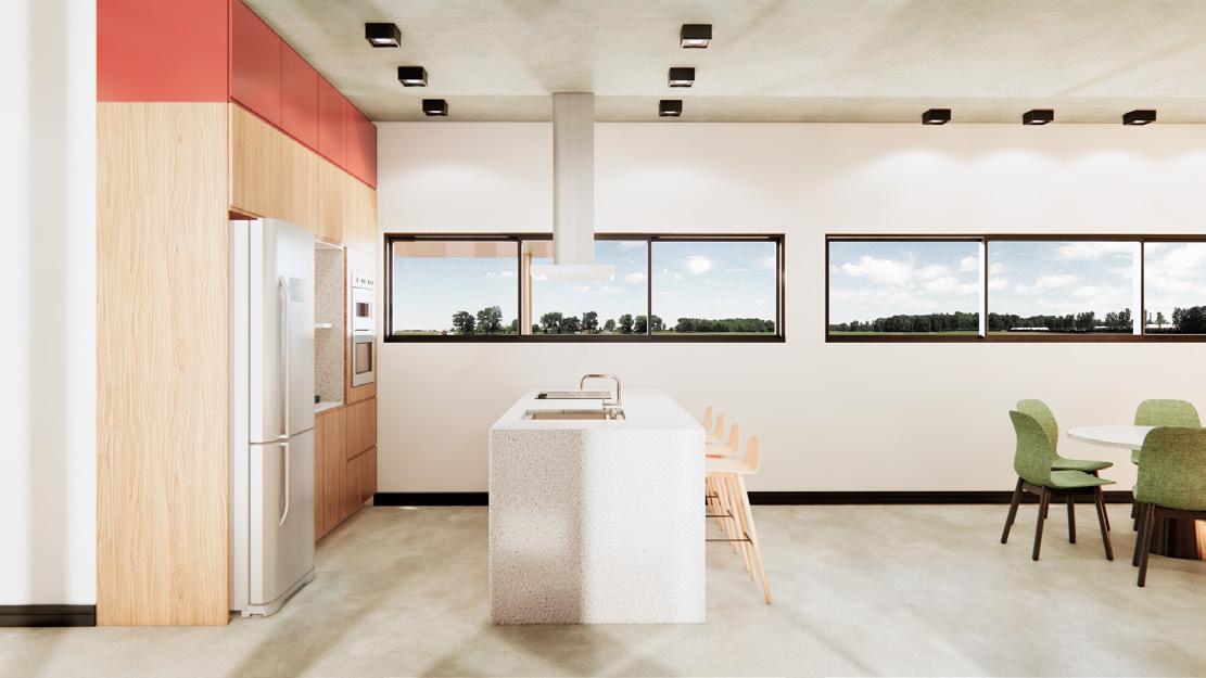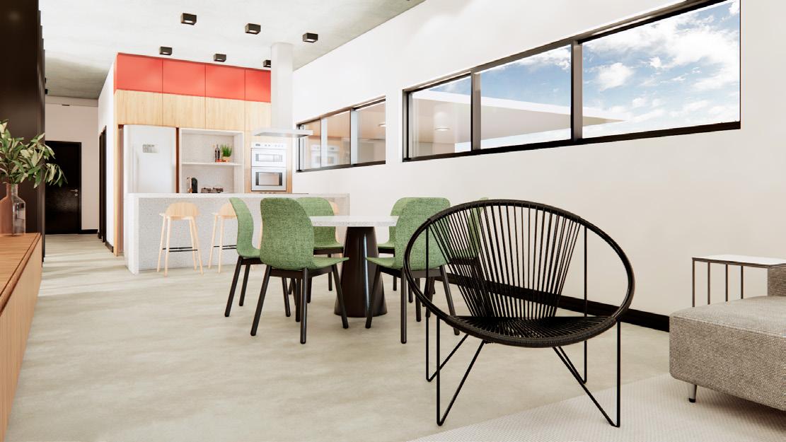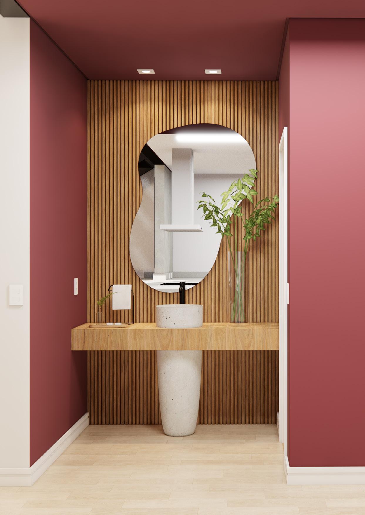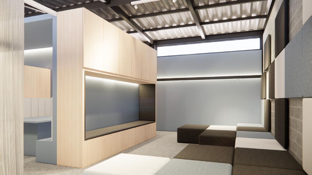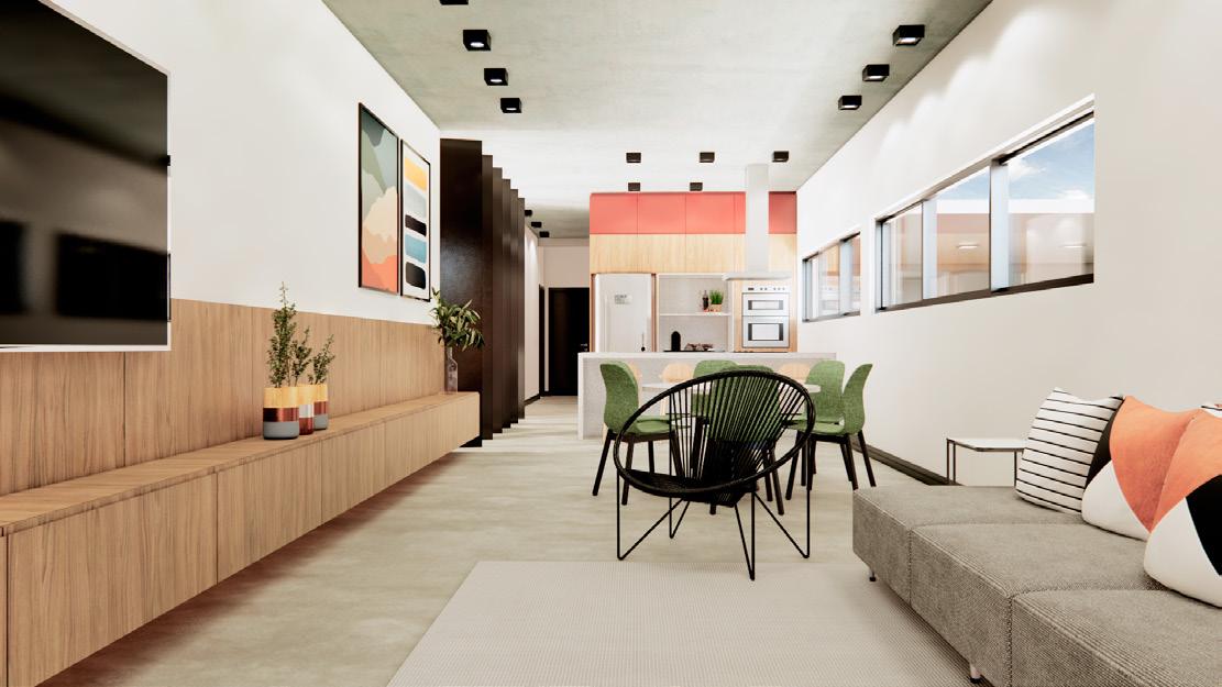“O interior da Casa Encaixe possui uma estética limpa, confortável e marcante. Afinal, os tons de madeira, cinza e branco foram usadas como base principal, e em seguida, aplicações de cores que contrastam e harmonizam com o ambiente, resultando em uma criação de identidade sútil.”