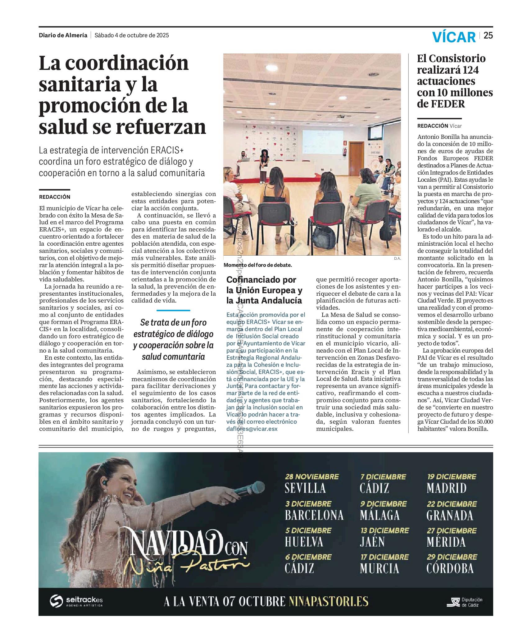 octubre con actividades como jornadas de Puertas Abiertas en el Taller Municipal de Jardinería, los días 14 y 15; la celebración de la Gala 30 Aniversario de la asociación El Timón el 18 de octubre, o talleres sobre bullying y protección de la Salud Mental en los centros escolares, así como una ruta de senderismo inclusiva por Punta Entinas con la colaboración de la Junta Local de Almerimar, entre otros.