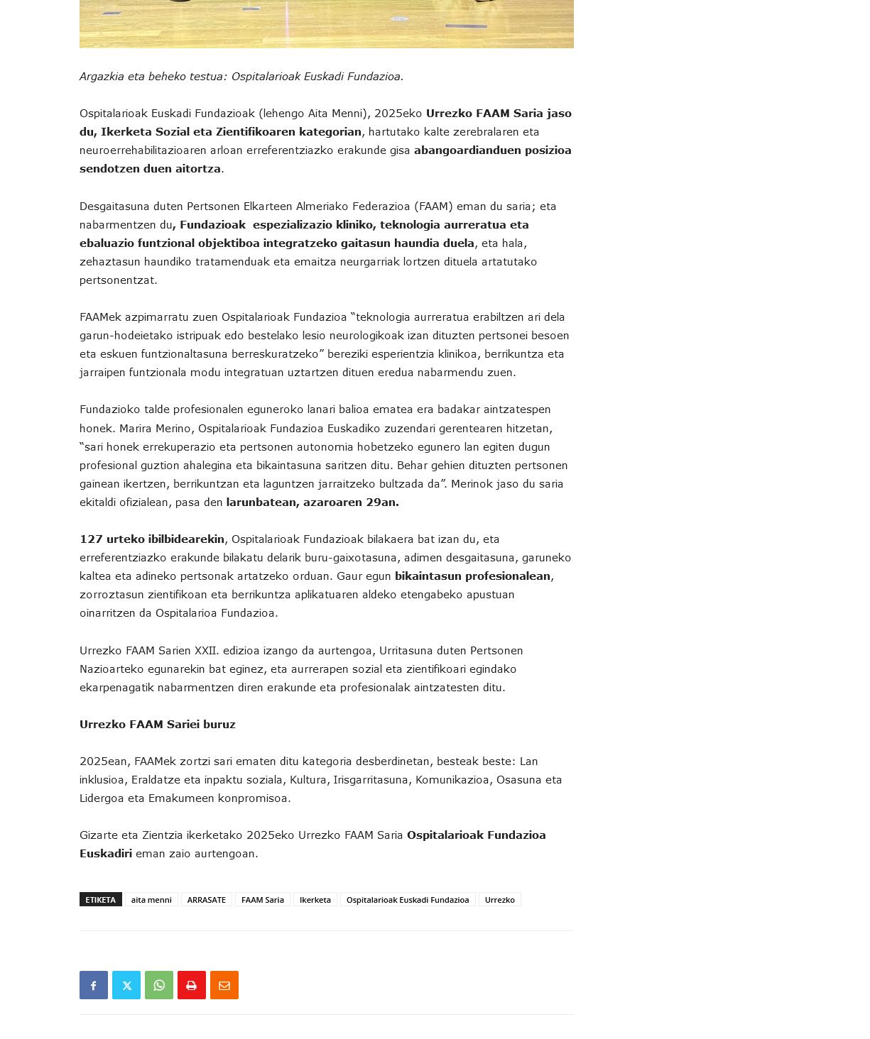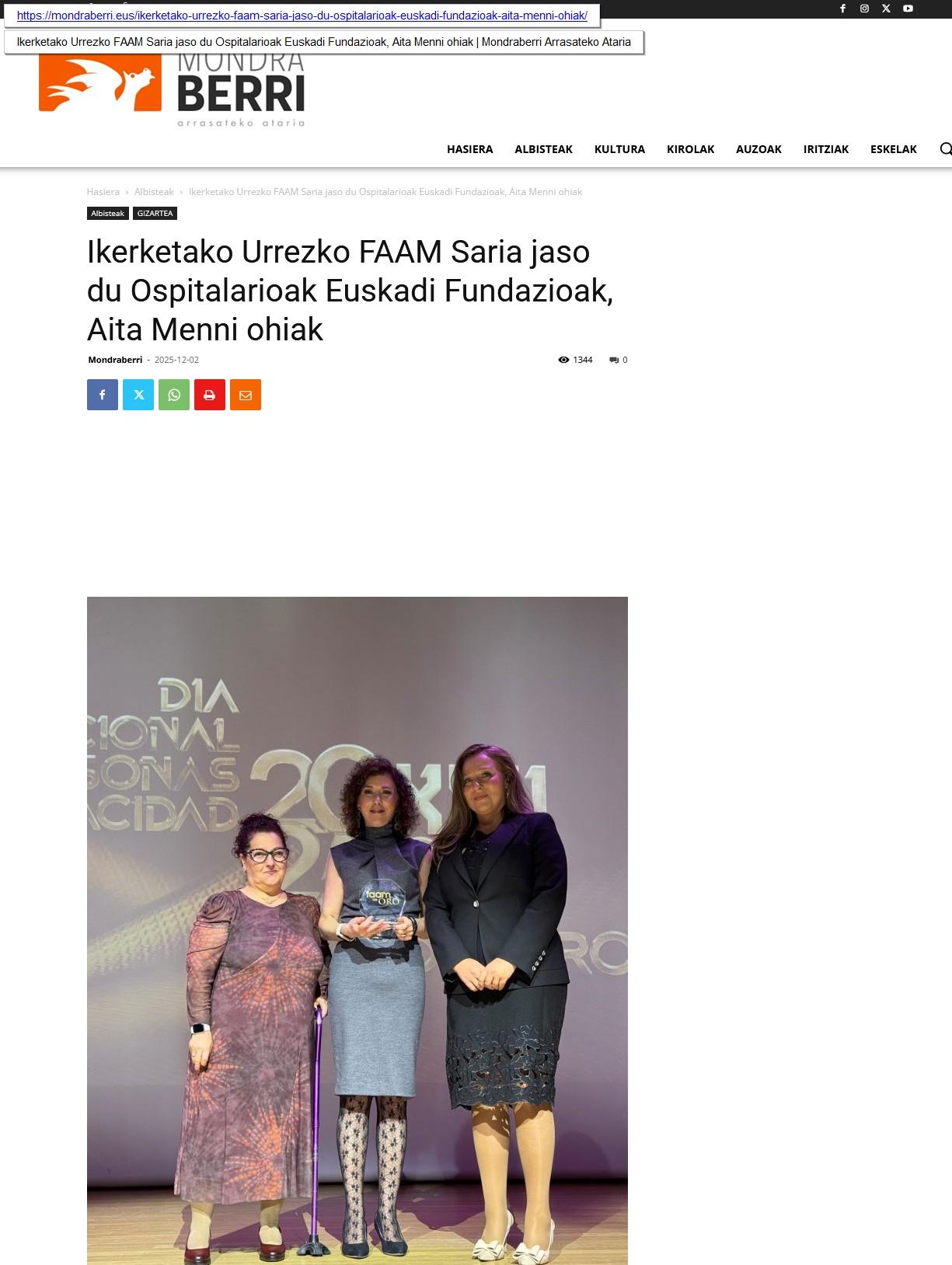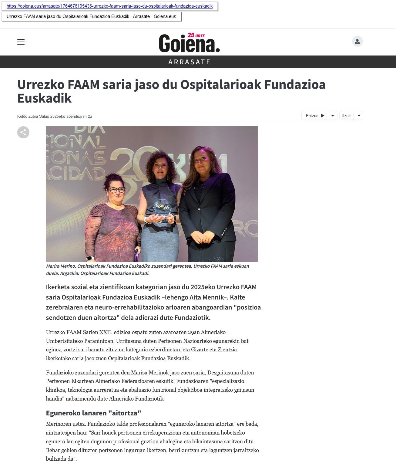 Ospitalarioak Fundazioa Euskadi -anteriormente Aita Menni- ha sido distinguida con el Premio FAAM de Oro 2025 en la categoría de Investigación Social y Científica. El galardón, otorgado por la Federación Almeriense de Asociaciones de Personas con Discapacidad (FAAM), destaca la capacidad de la Fundación para "integrar alta especialización clínica, tecnología avanzada y evaluación funcional objetiva".