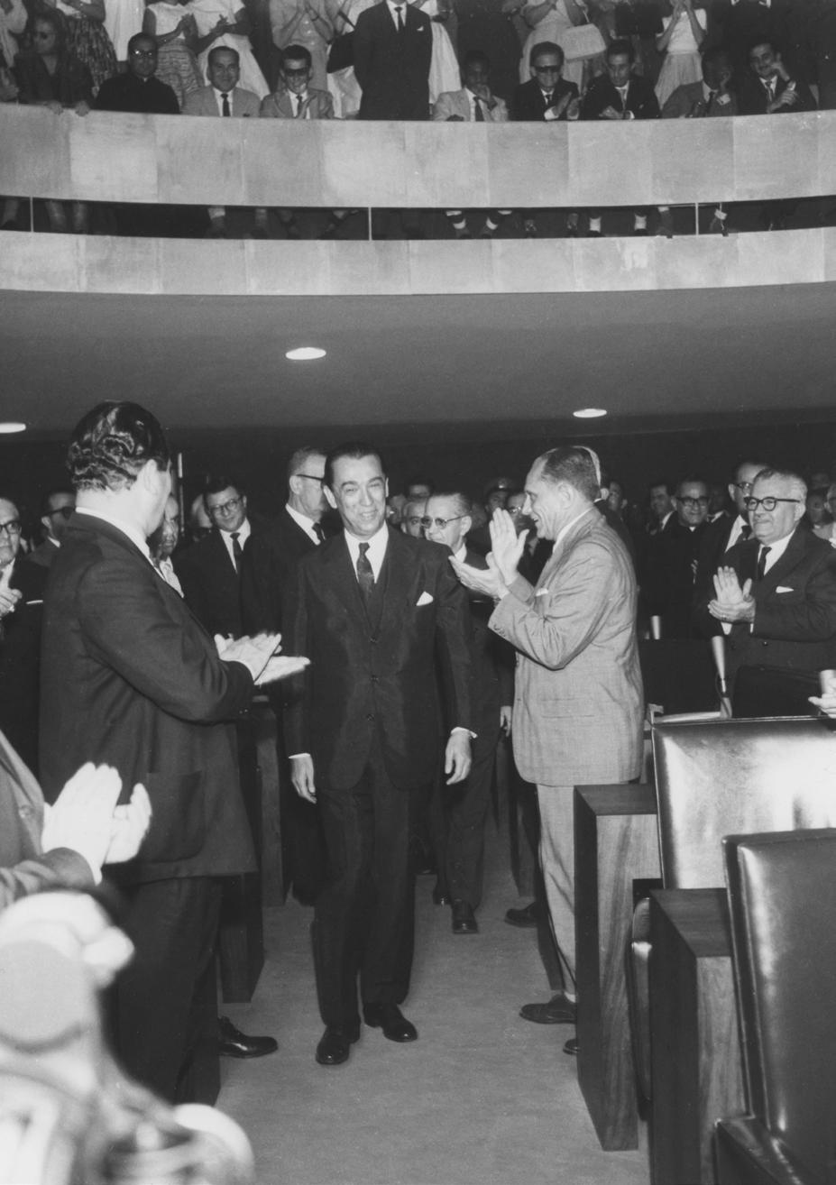 Da esq. para a dir., em primeiro plano: Cardeal Armando Lombardi, general Nelson de Mello, chefe do Gabinete Militar, JK, Sarah e Israel Pinheiro, no Palácio da Alvorada, na inauguração de Brasília 1960