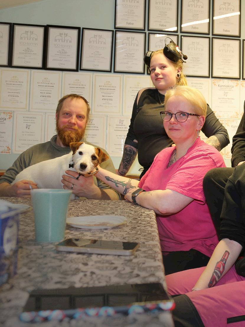 Navetan taukotuvan seiniltä löytyy kymmenittäin kunniakirjoja. Se on osoitus tilan onnistumisesta työssä eläinten hyvinvoinnissa ja jalostuksessa. Pöydän ääressä istuvat Jyrki ja Susanna Koivumäki sekä Jonna Peltonen. Takana seisovat Jenna Harju (vas) ja Janica Koivumäki.