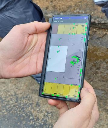 Näkymä lehmistä kännykän paikannusnäyttötilassa. Vihreät pallot näyttävät lehmän sijainnin navetassa sekä korvanumeron.