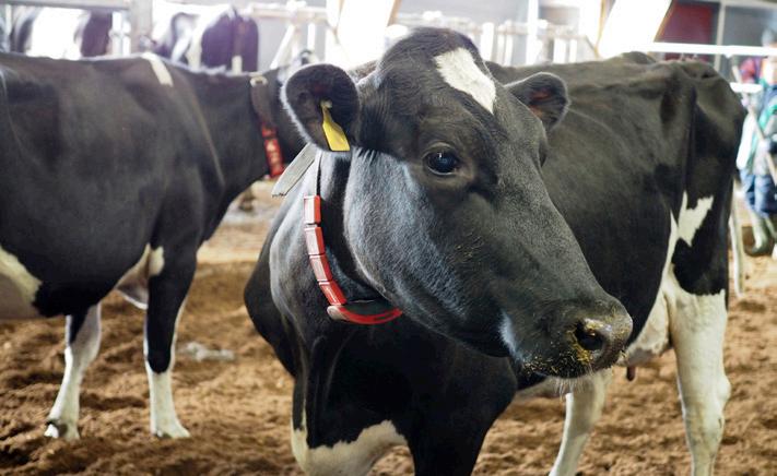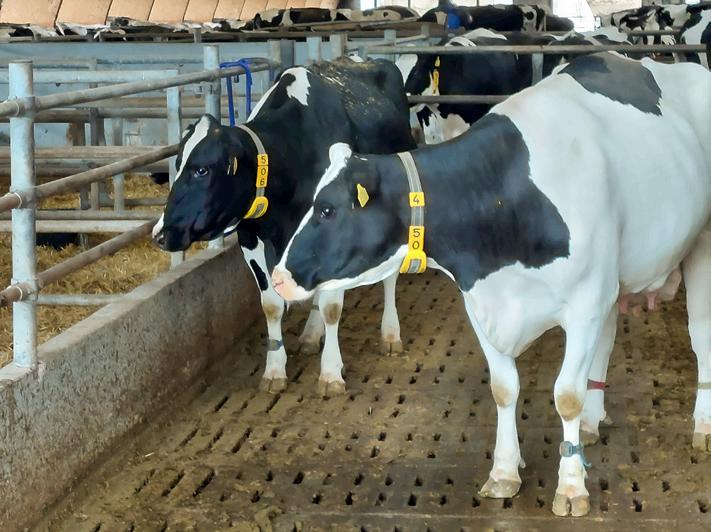 Kantoniemen tilan navetassa eläimiä seurataan Nedapin avulla. Tieto kertyy järjestelmään lehmien keltaisten kaulaanturien kautta.
