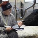 Laura Mäki-Välkkilä tarkastelevat karjan tietoja koneelta.