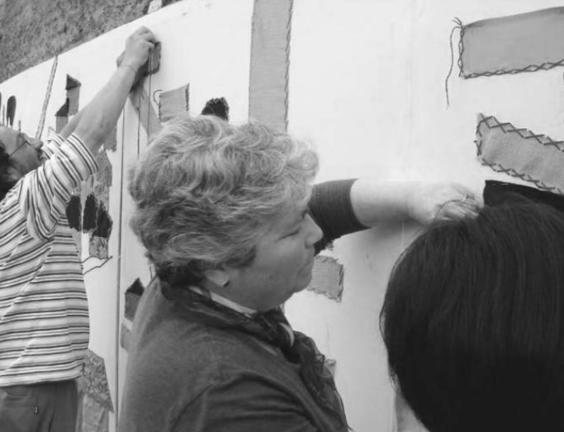 La piel de la memoria - proposta colaborativa da artista Suzanne Lacy com a antropóloga Pilar Riaño-Alcalá e os habitantes do bairro de Antióquia, Medellín, no projeto La Piel de la Memoria, Barrio Antioquia: Pasado, presente y futuro, foi promovido pela