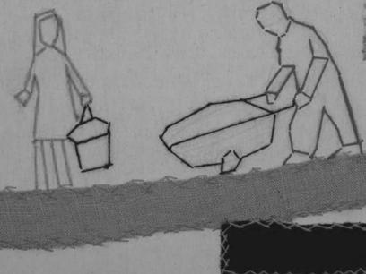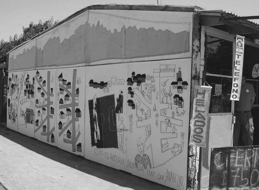 Proyecto Fachada na Villa Simón Bolivar - Casa-arpilleraproposto pelo TUP (Trabajos de Utilidad Pública) Arte Colectivobuscou revelar histórias da vila pela narrativa de suas famílias. O processo partiu de conversa com moradores, agenciada por uma dirigente comunitária, depois visita às casas, a seleção das cinco primeiras da Villa e o desenvolvimento de cinco ações. Casaarpillera se deu na fachada da casa de María Isabel Meléndez, que por meio das arpilleras, da época ditatorial, retomou a confecção comunitária de uma delas sobre sua história na vila.