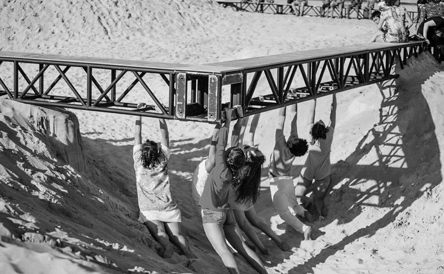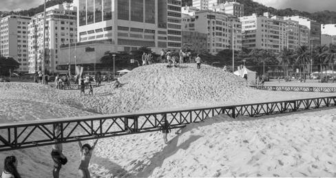 a praia e o tempo - proposto pelo gru.a (grupo de arquitetos) em colaboração com a coreógrafa francesa Julie Despraires para a 9a edição do Tempo_Festival (Festival Internacional de Artes Cênicas do Rio de Janeiro) - partiu de duas operações: demarcação do território e movimento do solo, que juntas geraram uma nova paisagem topográfica e um espaço entre arte e cotidiano.