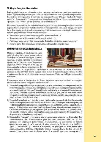 3. Organização discursiva Pode-se deduzir que no plano discursivo, os textos explicativos-expositivos constituemseá de segmentos expositivos que alternam discursivamente com segmentos explicativos. Expositivos correspondem à sucessão de informações que têm por finalidade “fazer saber” e “fazer conhecer”; enquanto que os explicativos, visam “fazer compreender” o “porque?” e o “como” de um processo ou de uma relação. Devido ao seu carácter didáctico-informativo, o texto expositivo-explicativo é também suportado por segmentos metadiscursivos. Estes segmentos são assim designados pelo facto de o sujeito servir-se deles para marcar explicitamente uma articulação no discurso, sempre que pretender, dentre outras intenções: • Anunciar o que vai ser dito (em seguida, iremos analisar…); • Resumir o que se disse (como acabámos de referir…); • Antecipar o que vai ser dito (enunciação de títulos, subtítulos, numeração, etc.) ; • Focar o que é dito (mudanças tipográficas, sublinhados, negrito, etc.).