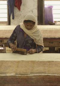 A skilled block maker carves the design by hand into hard teak wood, which is then dipped into a tray containing vegetable or chemical dyes and applied with skilled precision onto yards of stretched fabric.