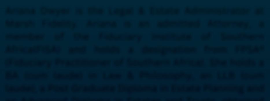 Ariana Dwyer is the Legal & Estate Administrator at Marsh Fidelity. Ariana is an admitted Attorney, a member of the Fiduciary Institute of Southern Africa(FISA) and holds a designation from FPSA® (Fiduciary Practitioner of Southern Africa). She holds a BA (cum laude) in Law & Philosophy, an LLB (cum laude), a Post Graduate Diploma in Estate Planning and an Advanced Diploma in Estates and Trusts, obtained