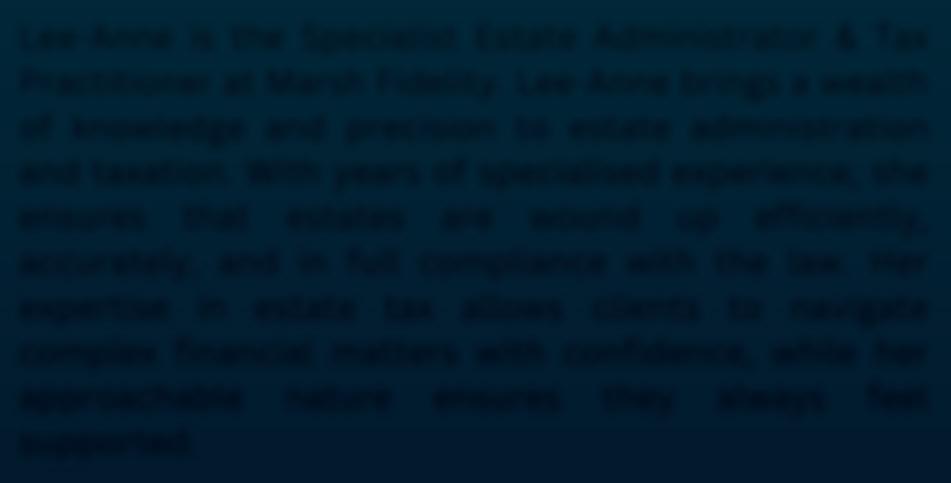 Lee-Anne is the Specialist Estate Administrator & Tax Practitioner at Marsh Fidelity. Lee-Anne brings a wealth of knowledge and precision to estate administration and taxation. With years of specialised experience, she ensures that estates are wound up efficiently, accurately, and in full compliance with the law. Her expertise in estate tax allows clients to navigate complex financial matters with confidence, while her approachable nature ensures they always feel supported.
