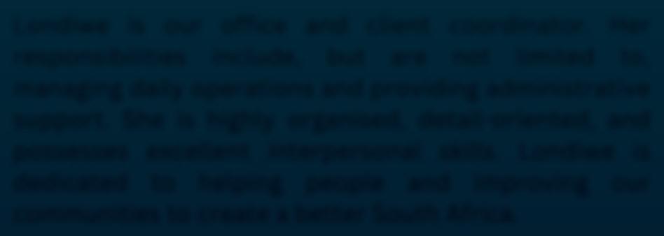 Londiwe is our office and client coordinator. Her responsibilities include, but are not limited to, managing daily operations and providing administrative support. She is highly organised, detail-oriented, and possesses excellent interpersonal skills. Londiwe is dedicated to helping people and improving our communities to create a better South Africa.