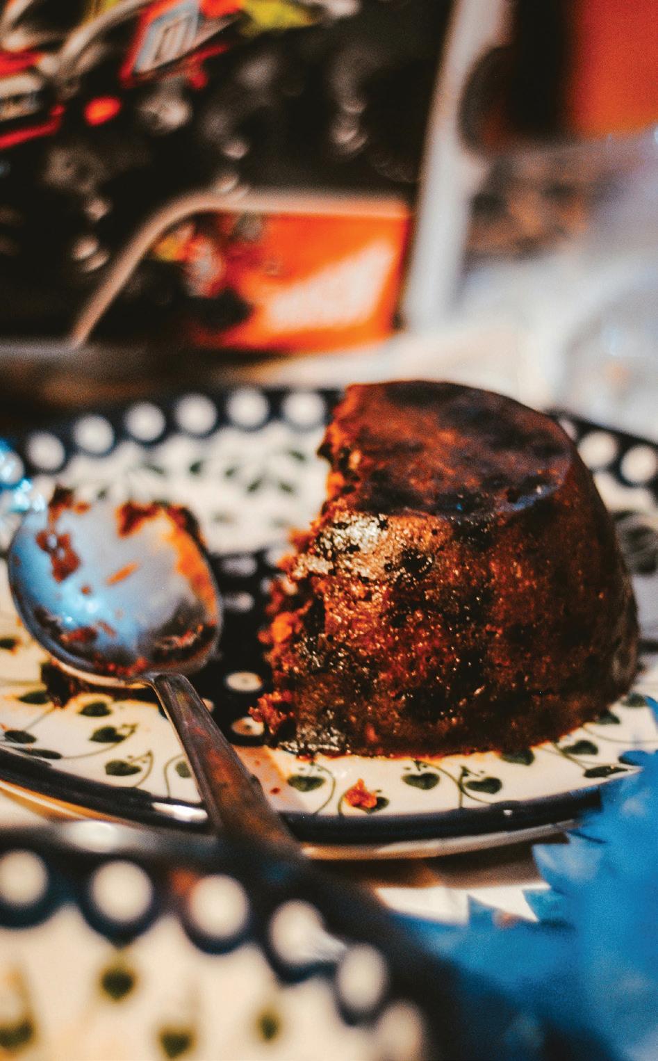 A rich, sticky pudding packed with dried fruit, spices, and a hint of bourbon.