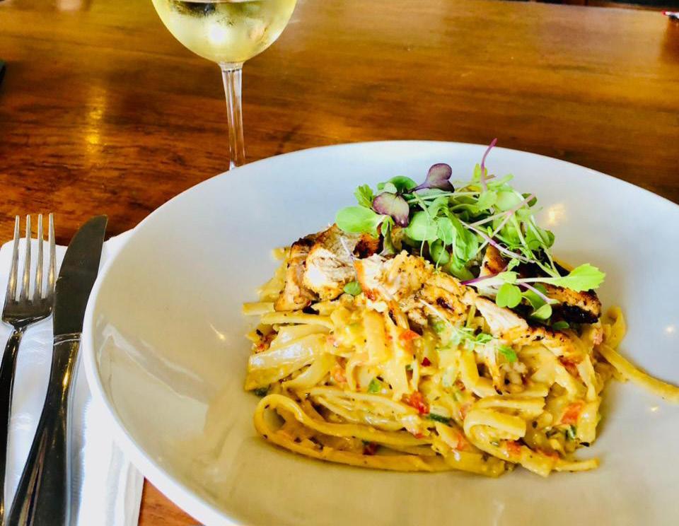 5. Plate the pasta mix in the middle of a large bowl. Slice the cooked chicken fillet diagonally, and serve one on the top of each pasta bowl.