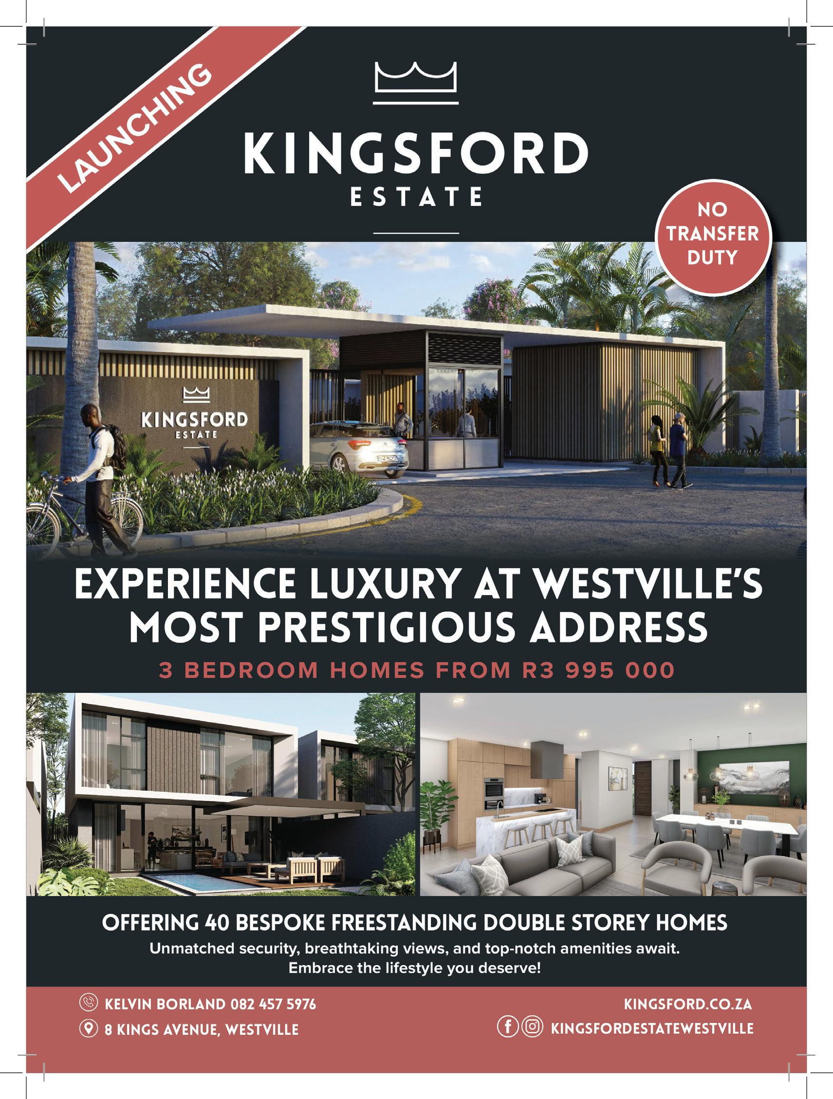 6 WWW.ESTATESMAGAZINE.CO.ZA At Serenity Hills Eco Estate, residents enjoy a holistic lifestyle with 25+ amenities, state-of-the-art security, discounted solar packages for sustainable living, and a backup water reservoir. Come and experience the perfect blend of eco-conscious living and comfort at our residential estate. Visit www.serenityhills.co.za to learn more or contact us on home@serenityhills.co.za or 073 142 8292. Old Izotsha Rd, Margate, KZN. Your Tranquil home Amidst Nature from R4 485 000 No transfer duty Forest Pods from R1 550 000 No transfer duty 2,3 & 4 Bed Freestanding Homes