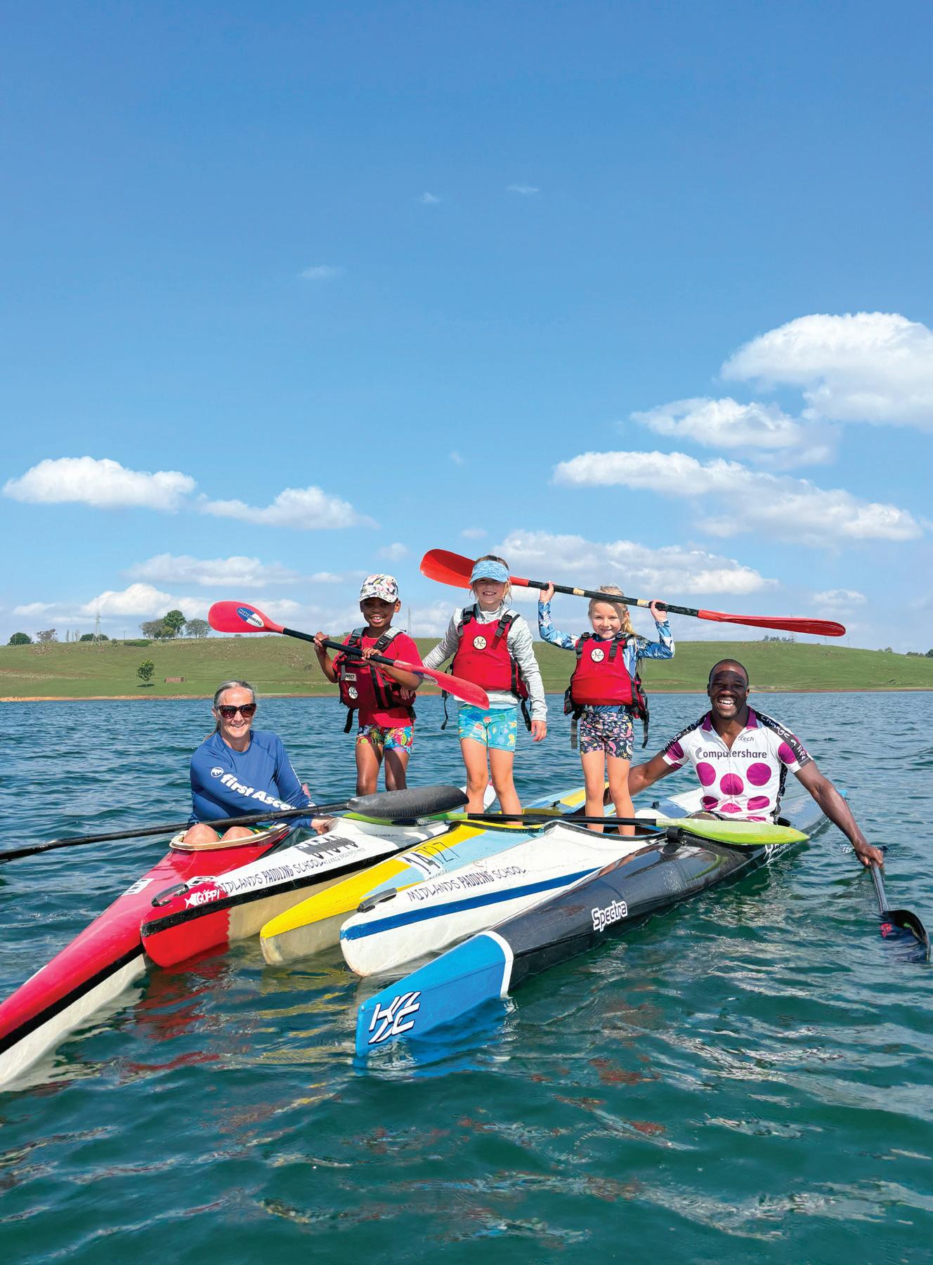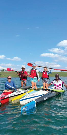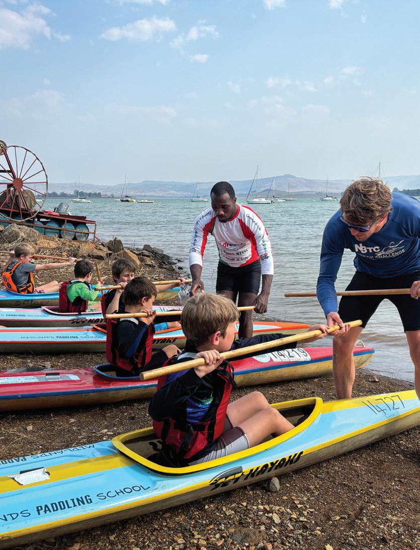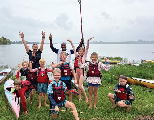 Meet Rachel and Kyle Friedenstein, a dedicated couple who saw an opportunity to continue growing a sport in the community. When the pandemic struck in 2020 and school sports were cancelled, a few friends asked if Kyle could coach their children in paddling on their farm in Curry’s Post. Word spread, and with borrowed ‘guppy’ boats, a small group of kids began lessons. Recognising the potential, Midlands Paddling School was born and relocated to Midmar Dam, making training more accessible. With the support of the Midmar Canoe Club and dedicated coaches, the school quickly flourished. Midlands Paddling School offers tailored classes. Young Guppies (6-7-years-old) start with the basics, while 8-12-year-olds choose from beginner, intermediate, or performance classes, with the latter for those race training. Teens (13-18-yearsold) have beginner and intermediate options to develop skills without the pressure of competition.