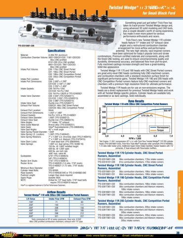 Specifications Material: A-356-T61 aluminum Combustion Chamber Volume: 5601-C00/C01/C02; T-561-C02/C03: 56cc CNC-profiled 6101-C00: 61cc CNC-profiled 6601-C01/C03; T661-C02/C03: 66cc CNC-profiled Intake Port Volume: C00: 170cc CNC Street Ported C01: 190cc CNC Street Ported C02: 190cc CNC Competition Ported C03: 205cc CNC Competition Ported Intake Port Location: Stock Intake Port Dimensions: C00: 2.000" x 1.200" C01/C02: 2.100" x 1.280" C03: 2.250" x 1.400" Intake Gaskets: C00: Fel-Pro 1250 C01/C02: Fel-Pro 1262 C03: Fel-Pro 1262R or TFS-52400921 Intake Valve Diameter: C00: 2.020" (TFS-52500211) C01/C02: 2.055" (TFS-52500213) C03: 2.080" (TFS-52500215) Intake Valve Seat: Ductile iron (TFS-52500271) Exhaust Port Volume: C00/C01: 66cc CNC Street Ported C02/C03: 66cc CNC Competition Ported Exhaust Port Location: Stock Exhaust Port Dimensions: 1.250" x 1.480" Exhaust Gaskets: Fel-Pro 1415 or TFS-51490931 Exhaust Valve Diameter: 1.600" (TFS-52500212) Exhaust Valve Seat: Ductile iron (TFS-30600274) Valve Angles: 11° intake, 13° exhaust Valve Guide Material: Bronze alloy (TFS-52500251) Valve Seals: Viton® fluoroelastomer (TFS-30600455) Valve Seat Angles: 45° x multi angle Valve Spring Pocket Diameter: 1.640" Valve Spring I.D. Locators: 1.300" (TFS-21400442) Valve Spring Retainers: 7° x 1.300" o.d. chromoly steel (TFS-21400415) 7° x 1.300" o.d. titanium (TFS-214T0415) Valve Stem Locks: 7° steel bead lock (TFS-30600444) Valve Springs: 1.300" o.d. dual spring (TFS-16306-16) 150 lbs. @ 1.800" installed height 438 lbs. @ 1.200" open 448 lbs. per inch rate .600" max. valve lift Guideplates: 5/16" (TFS-51400623) 3/8" (TFS-51400624) Rocker Arm Studs: 7/16" (TFS-51400614) Rocker Arms: TFS-51400520 (1.6 ratio, 7/16" studs) TFS-51400521 (1.72 ratio, 7/16" studs) Minimum Bore Diameter: 4.000" Cylinder Head Bolts: TFS-92005 Head Gaskets: TFS-51494030-040 or TFS-51494060-040 Pushrod Length: Longer than stock required Spark Plugs: Autolite 3924 NOTE: Drilled for 1/2" head bolts; 7/16" head bolts require TFS-51400419 reducer Viton® is a registered trademark of DuPont Performance Elastomers.