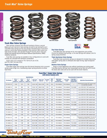 Track Max Valve Springs Valve springs compress and rebound hundreds of times a second. Make sure your next set of valve springs are built to last and built to win! Track Max valve springs are the only springs manufactured to Trick Flow’s rigorous, world-class testing standards. Every spring is CNC-coiled from high tensile-strength, extra-durable Pacaloy™ chrome-silicon steel and double shot-peened beyond Aerospace Material Specifications (AMS) reliability standards. Track Max valve springs are available in four configurations to work with virtually any camshaft and valvetrain combination. Sold in sets of 16, except for TFS-15410-24 (set of 24) and TFS-15411-32 (set of 32).