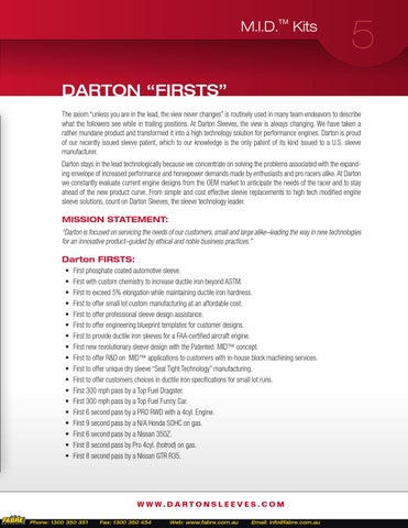 DARTON “FIRSTS” The axiom “unless you are in the lead, the view never changes” is routinely used in many team endeavors to describe what the followers see while in trailing positions. At Darton Sleeves, the view is always changing. We have taken a rather mundane product and transformed it into a high technology solution for performance engines. Darton is proud of our recently issued sleeve patent, which to our knowledge is the only patent of its kind issued to a U.S. sleeve manufacturer. Darton stays in the lead technologically because we concentrate on solving the problems associated with the expanding envelope of increased performance and horsepower demands made by enthusiasts and pro racers alike. At Darton we constantly evaluate current engine designs from the OEM market to anticipate the needs of the racer and to stay ahead of the new product curve. From simple and cost effective sleeve replacements to high tech modified engine sleeve solutions, count on Darton Sleeves, the sleeve technology leader.