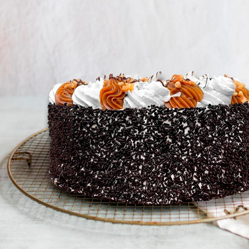 Bizcochuelo de vainilla relleno de dulce de leche y butter cream orillado con granas de coco.