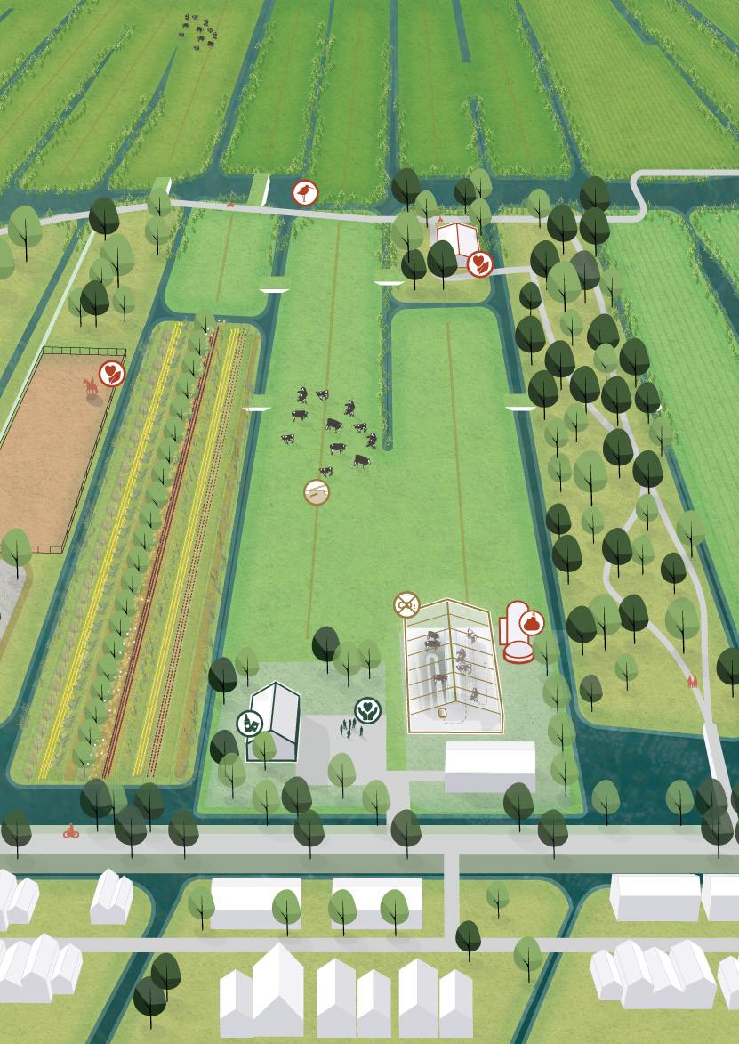 Hier ligt voor de landbouw de nadruk op natuurinclusiviteit en recreatie. Daarbij is dit trouwens vaak al het geval, zoals in de regiopoorten rond Amsterdam. Het gebied dat ontstaat is nog steeds een veenweidegebied met veehouderij, maar extensiever en met eens stevigere groenblauwe dooradering.
