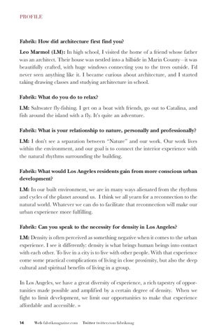 Fabrik: How did architecture first find you? Leo Marmol (LM): In high school, I visited the home of a friend whose father was an architect. Their house was nestled into a hillside in Marin County—it was beautifully crafted, with huge windows connecting you to the trees outside. I’d never seen anything like it. I became curious about architecture, and I started taking drawing classes and studying architecture in school. Fabrik: What do you do to relax? LM: Saltwater fly-fishing. I get on a boat with friends, go out to Catalina, and fish around the island with a fly. It’s quite an adventure. Fabrik: What is your relationship to nature, personally and professionally? LM: I don’t see a separation between “Nature” and our work. Our work lives within the environment, and our goal is to connect the interior experience with the natural rhythms surrounding the building. Fabrik: What would Los Angeles residents gain from more conscious urban development? LM: In our built environment, we are in many ways alienated from the rhythms and cycles of the planet around us. I think we all yearn for a reconnection to the natural world. Whatever we can do to facilitate that reconnection will make our urban experience more fulfilling. Fabrik: Can you speak to the necessity for density in Los Angeles? LM: Density is often perceived as something negative when it comes to the urban experience. I see it differently: density is what brings human beings into contact with each other. To live in a city is to live with other people. With that experience come some practical complications of living in close proximity, but also the deep cultural and spiritual benefits of living in a group. In Los Angeles, we have a great diversity of experience, a rich tapestry of opportunities made possible and amplified by a certain degree of density. When we fight to limit development, we limit our opportunities to make that experience affordable and accessible. »