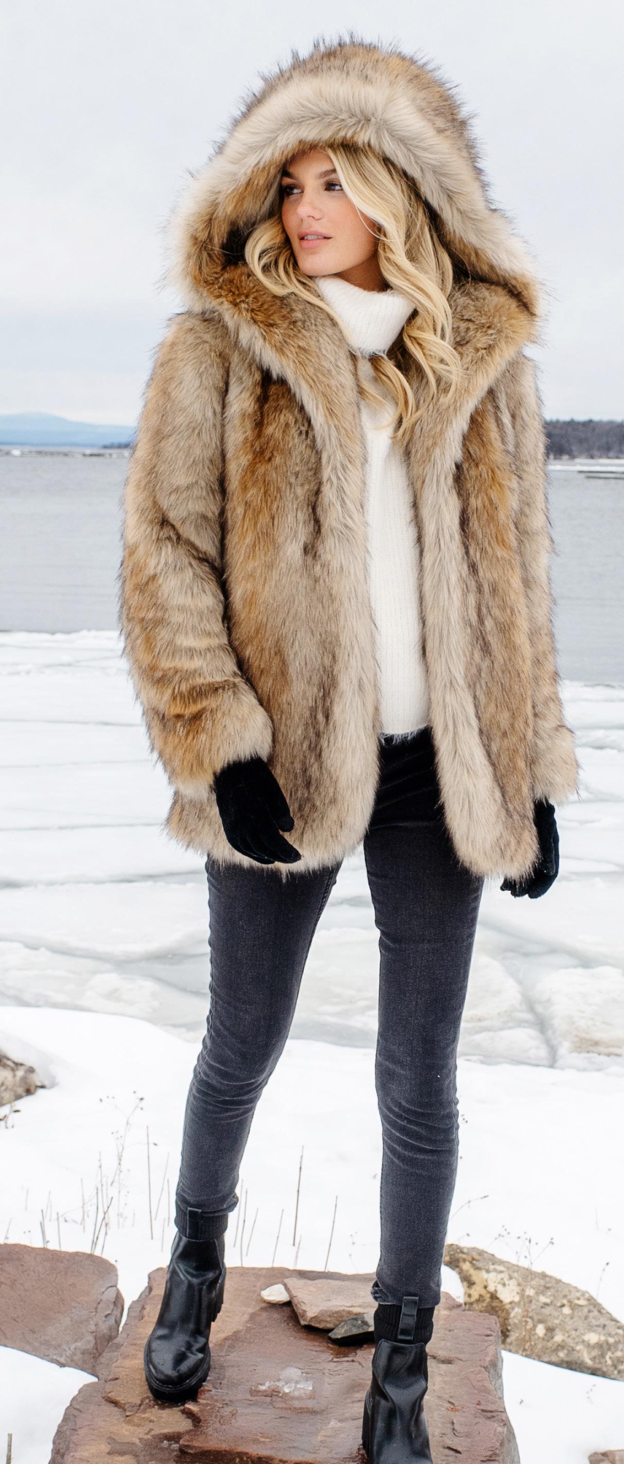 Cedar, Grey or Ivory Fox. Satin lined hood. European hook and ring closures. Pockets. Imported. 26". XS-3X 14690 | Ivory and Cedar | $375/NOW $295 14690 | Grey | $375/NOW $185