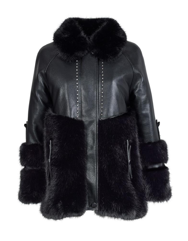Black. Studded faux leather trim and body with faux fur. Zip closure. Pockets. Imported. 29". XS-3X
