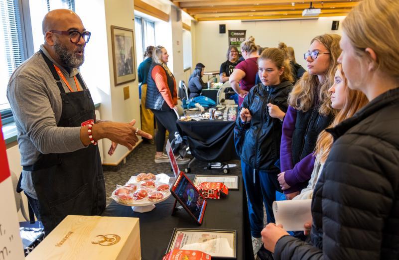Rivera listened keenly at the Sargento table as a representative described the food science careers available there.
