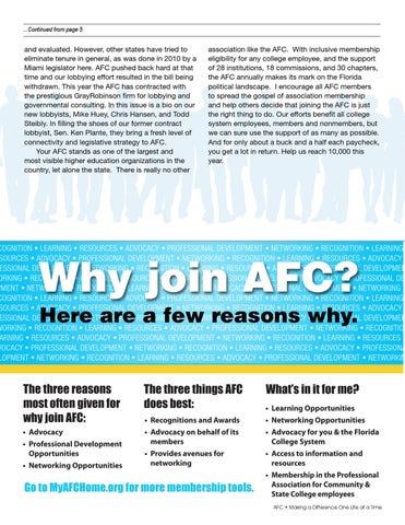 association like the AFC. With inclusive membership eligibility for any college employee, and the support of 28 institutions, 18 commissions, and 30 chapters, the AFC annually makes its mark on the Florida political landscape. I encourage all AFC members to spread the gospel of association membership and help others decide that joining the AFC is just the right thing to do. Our efforts benefit all college system employees, members and nonmembers, but we can sure use the support of as many as possible. And for only about a buck and a half each paycheck, you get a lot in return. Help us reach 10,000 this year.
